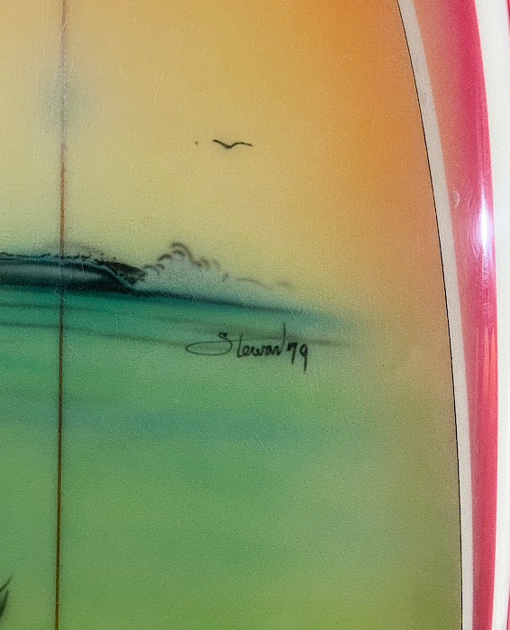 Ocean Pacific (Op) wave mural surfboard shaped in 1979. Airbrushed artwork by Bill Stewart. Featuring beautiful airbrushed scene depicting peeling right hand barrel with Hawaiian hibiscus flowers in the foreground. Bill Stewart was the 2nd person ever to airbrush a surfboard and was voted Best Airbrusher by Surfer Magazine in 1980. 6’4 winged swallow tail. Ride or display this breathtaking 1970s vintage surfboard work of art.