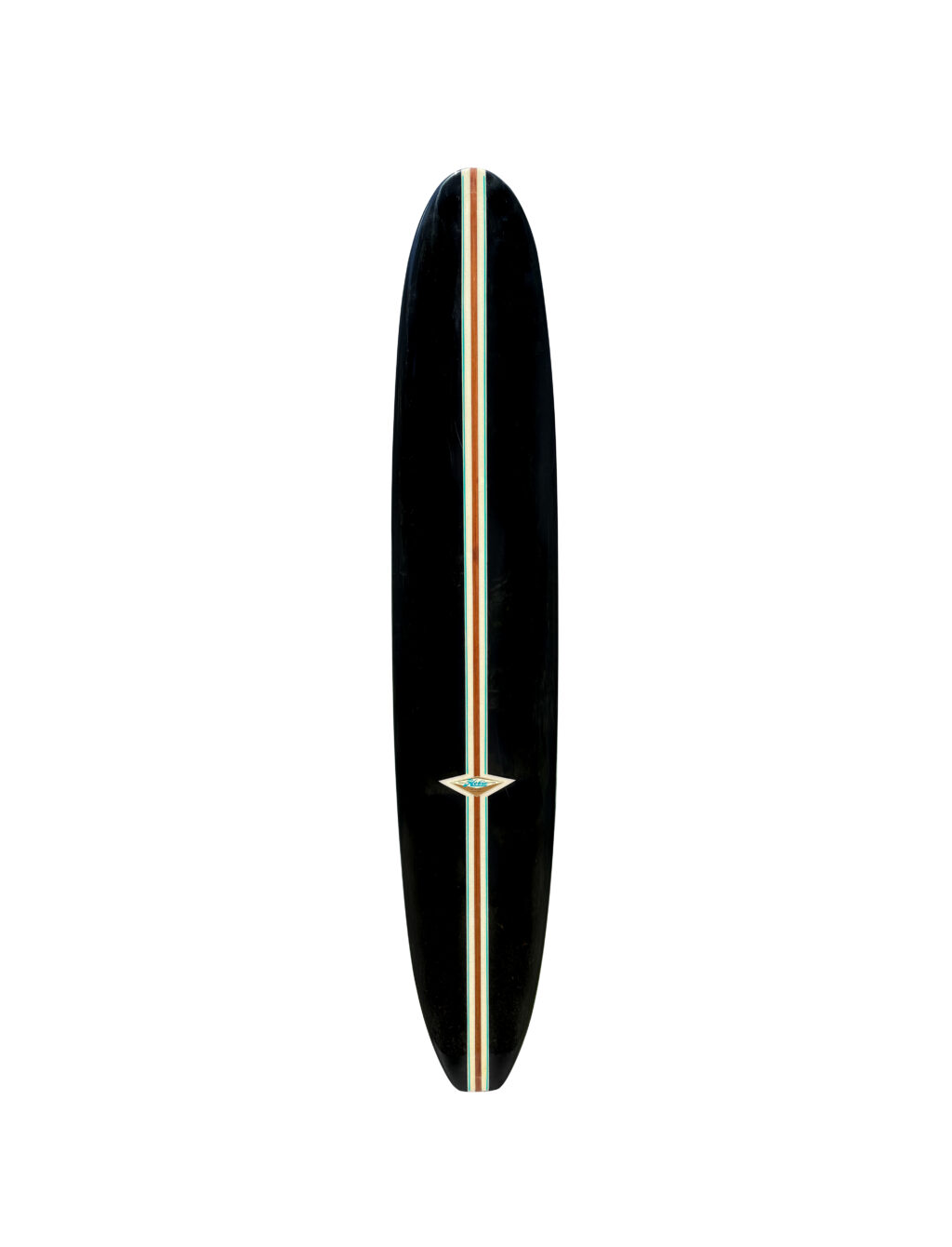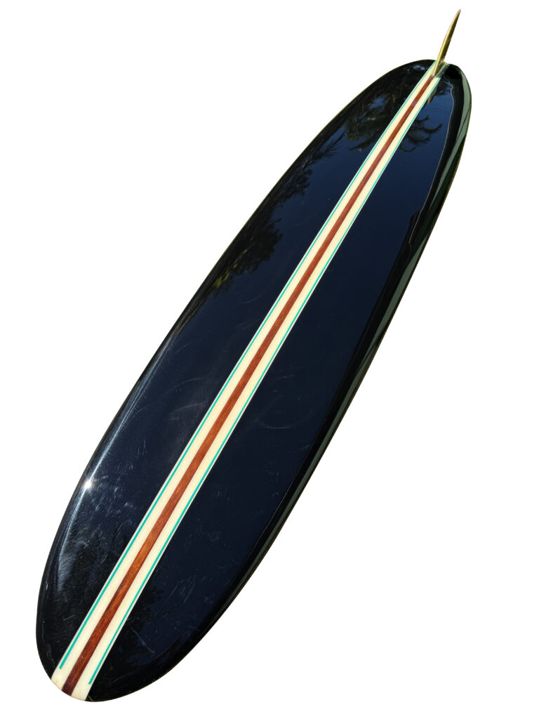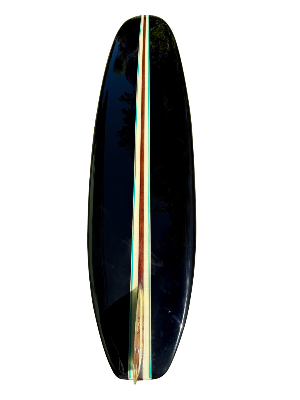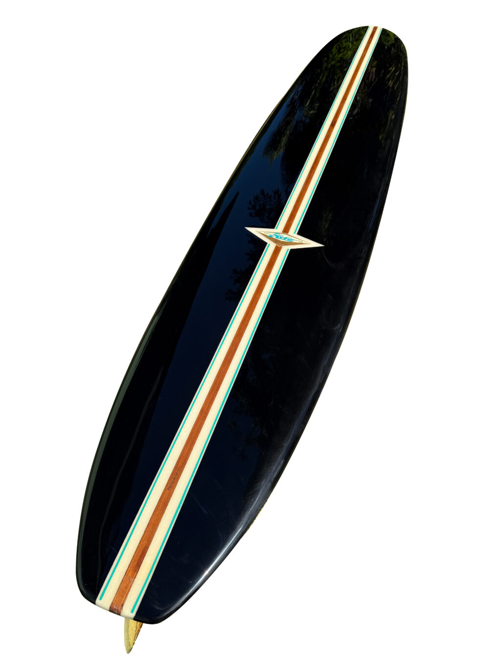Discover a true treasure of surf history with this masterfully restored 1960s Hobie longboard. At 9’6″ in length with a classic square tail, it reflects the clean, timeless lines that define the golden age of longboarding. The classic black panels and blue pinstripe accents radiate vintage charm, accenting the beautifully crafted fin — a detail long admired by both surfers and collectors.