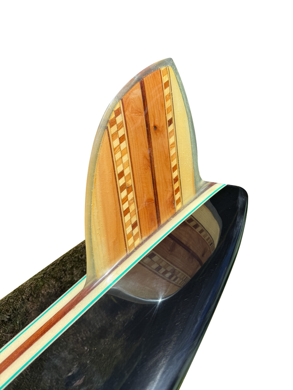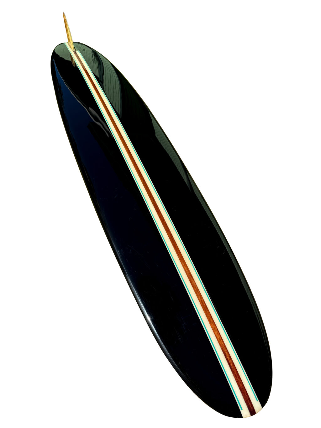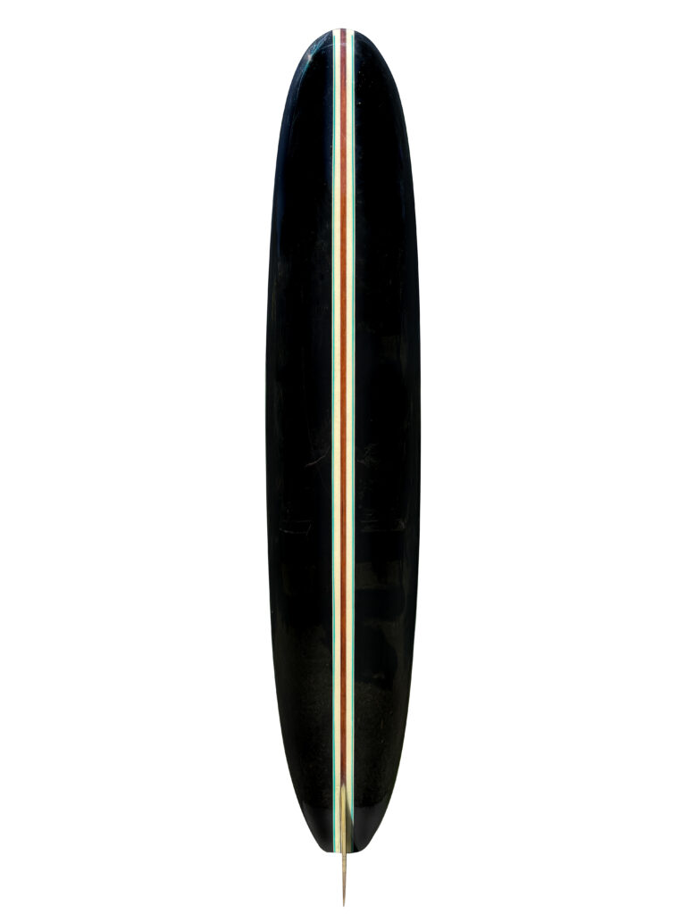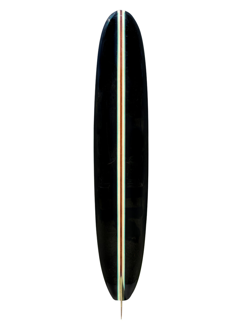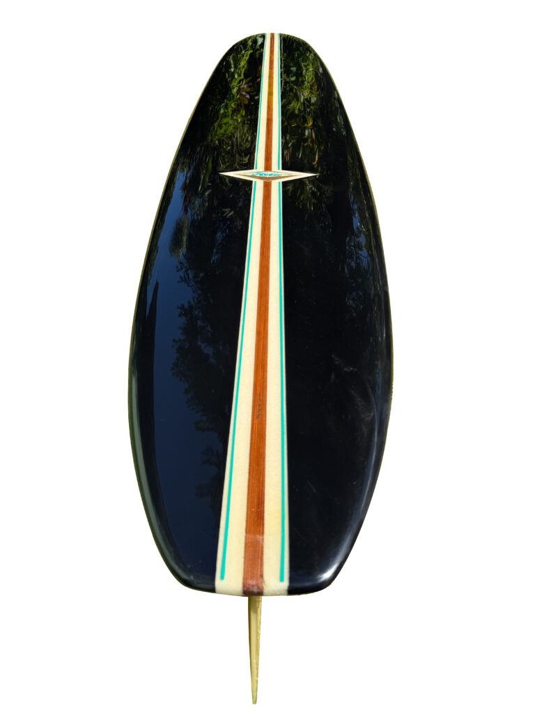 Discover a true treasure of surf history with this masterfully restored 1960s Hobie longboard. At 9’6″ in length with a classic square tail, it reflects the clean, timeless lines that define the golden age of longboarding. The classic black panels and blue pinstripe accents radiate vintage charm, accenting the beautifully crafted fin — a detail long admired by both surfers and collectors.
