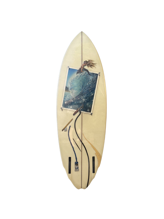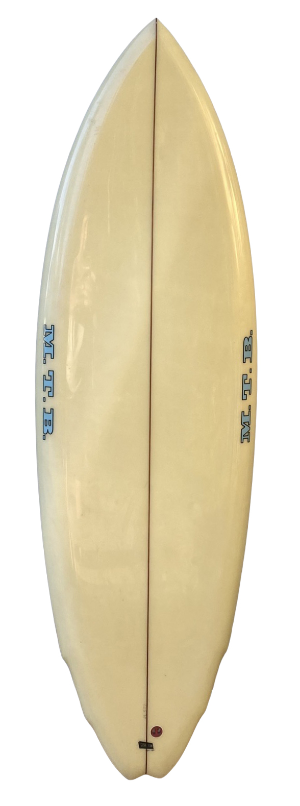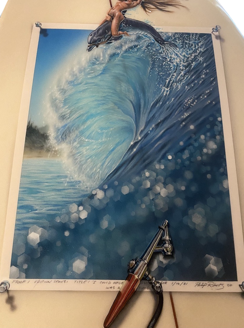 MTB 5’9 twin-fin surfboard shaped by Johnny Lucas in 1981. Featuring a double wing swallow tail shape with magnificent airbrushed work of art by the legendary Phil Roberts. Very unique piece depicting the master artist with the tools of his trade creating a beautiful wave mural of Banzai Pipeline, in his signature style. Phil Roberts was inducted into the East Coast Surfing Hall of Fame in 2016 for his contributions as an artist. He is also known for creating the perpetual Pipeline Masters trophy and annual Pipeline Masters trophy surfboards with Gerry Lopez. Use as a functional surfboard or decorative surfboard art piece!