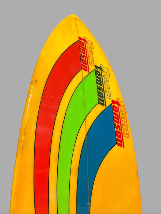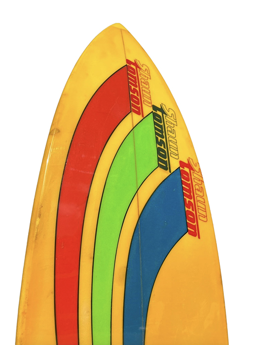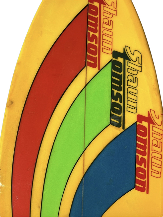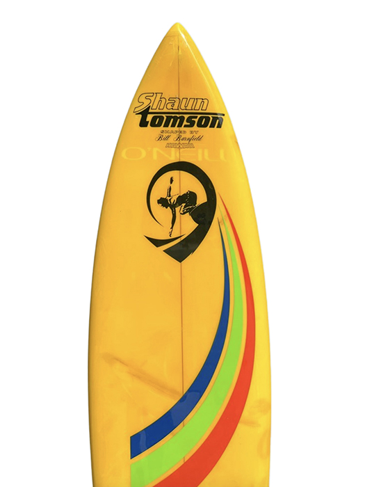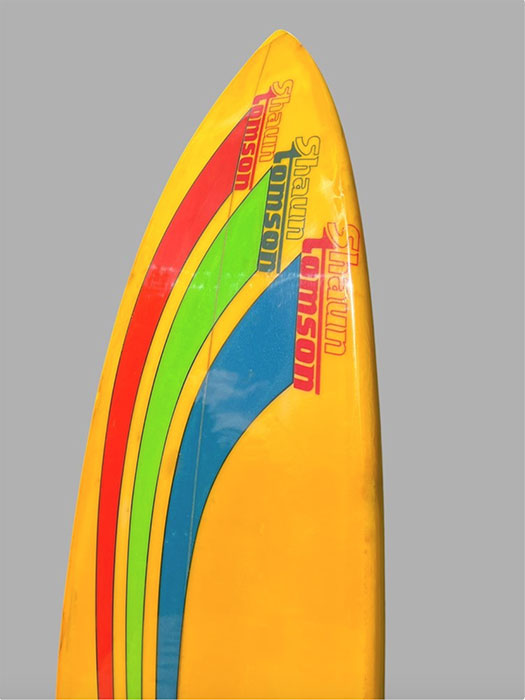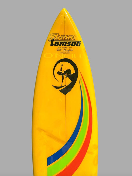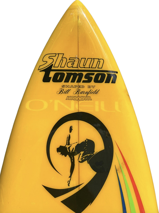 Tomson had this board shaped slightly longer and thicker through the nose to enhance bottom turns and generate the extra speed needed to set up and exit the tube—refinements that helped him excel during his 1977 World Championship campaign. The board carries Shaun’s signature Instinct logo on the nose, with Bill Barnfield’s initials “BB” on the foam above the stringer and under the glass, identifying it as a true custom made specifically for Tomson.