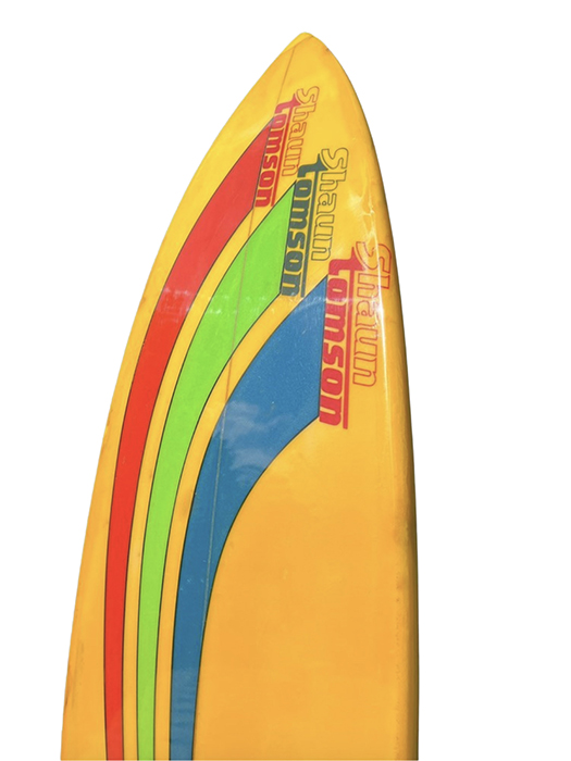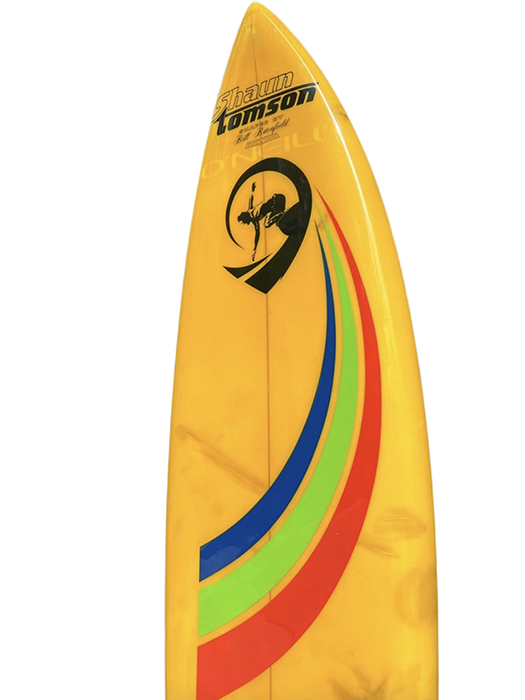 Offered here is Shaun Tomson’s personal surfboard, shaped by renowned Lightning Bolt craftsman Bill Barnfield. Finished in a rich yellow tint, the board features Tomson’s iconic green, blue, and red racing stripes running across both deck and bottom. A nearly identical example—shaped in 1978 but slightly shorter appears in Jim Winniman’s The Ultimate Guide to Vintage Surfboards (page 203). While both boards share a rounded tail, this board was built four inches longer at 7’0″ with added volume through the nose.