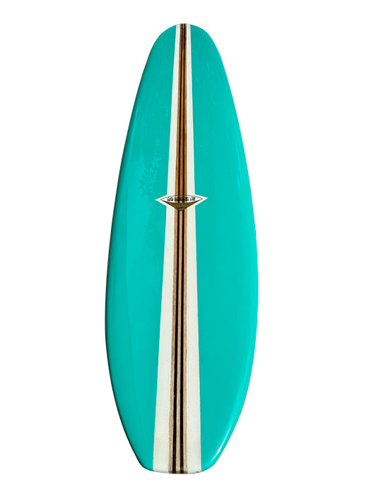 Own a slice of California surf history, this rare 9’0″ Yater longboard from the late 1950s / early 1960s is finished with striking turquoise panels and intricate checkerboard wooden fin. Beautifully restored by an expert with over 40 years experience, this board is equally at home underfoot or on a wall. Provenance ties it to the Santa Barbara surf shop era — one of the earliest commercial outfits run by Renny Yater — a name collectors revere for classic noseriders and finely tuned craftsmanship. A beautiful, surfable artifact for the serious collector or vintage rider.